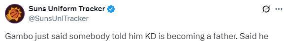 最近一段时间,杜兰特因处理家庭事务暂时离开球队,确定缺席火箭对阵太阳以及火箭对阵勇士的两场比赛,太阳记者爆料,37岁的杜兰特因孩子要出生才请假的;究竟杜兰特是否真的已经升级当爹,暂无权威报道,坐等后续报道,拭目以待吧。